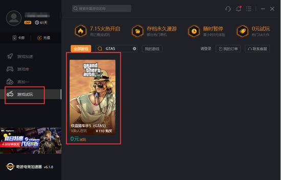 奇游加速器支持免费试用,并且还支持《GTA5》的免费试玩,试玩方法:下载奇游加速器,注册登陆、点击“游戏试玩”,在搜索框输入游戏名称(搜“GTA5”就行),选择“试玩体验卡”,0元即可下载游戏进行游玩。在这一个小时内,你可以完整的体验游戏内容、评估是否有入坑的必要性: