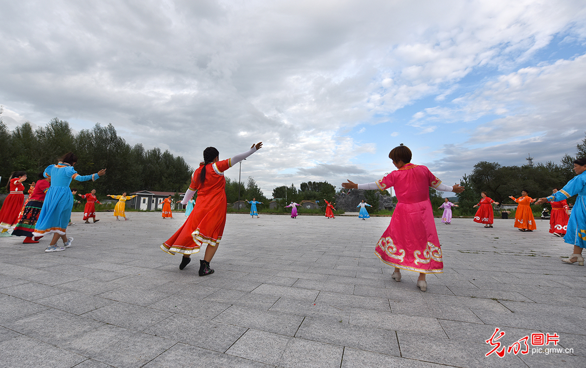 通过民族手工艺品制作来脱贫、增收、致富,只是鄂温克族人决战决胜脱贫攻坚的一部分。自1990年放下猎枪以来,他们成立农机合作社,实行全村土地整体流转,进行村集体资产股份制改革,发展民俗旅游,逐步走上了致富的道路。2019年,猎民村人均纯收入25000元。在打赢脱贫攻坚战的征程中,谱写出祖国北疆少数民族地区民族团结、和谐发展、共同繁荣的壮丽诗篇!图为8月3日,猎民村的村民在老神树广场跳起民族舞蹈。