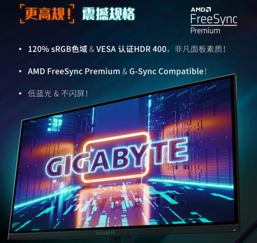 作为全能型电竞显示器,技嘉G27Q的屏幕素质非常傲人:支持120% sRGB色域,原生8BIT色深并且通过了HDR400认证,色彩表现让人赏心悦目。同时G27Q还贴心的支持低蓝光与不闪屏的特性,有效保护用户的视力健康。支持AMD FreeSync和NVIDIA G-Sycn Compatble功能,有效减少画面撕裂。接口方面,技嘉G27Q搭载2个HDMI 2.0接口+1个DP 1.2接口的组合,提供2个USB 3.0接口、1个USB 3.0 Type-B接口和3.5毫米耳机接口。可以说无论你是用于电竞游戏还是办公日常,这款显示器都能100%满足需求。