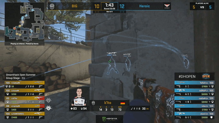 欧洲赛区A组的BIG在对阵到Heroic的图一两队表现的还算焦灼,在Heroic选择的Inferno上,前期3-8落后的Heroic还是通过强烈而有效的香蕉道控制,收获大量地图控制后Heroic的一波流进攻也逐渐有效。下半场两队继续咬紧比分,关键局k1to香蕉道单人四杀破点将Heroic的经济直接击垮,乘胜追击的BIG成功以16-14险胜。