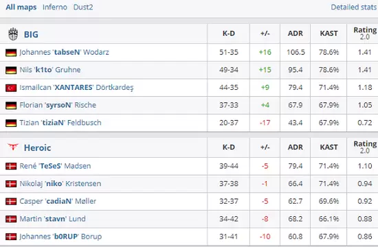 图二的Dust2德国战车持续开炮,上半场做防守方的BIG在k1to与tabseN的双重爆发下直接以12-3大比分领先,下半场Heroic勉强追分但已为时已晚,最终BIG以16-10的比分击败Heroic以头名晋级淘汰赛。