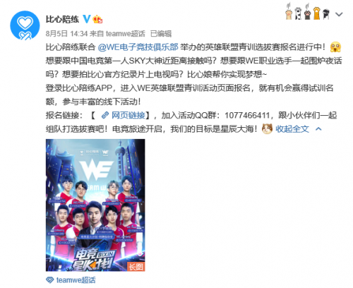 8月,比心陪练联合WE俱乐部举办英雄联盟青训选拔赛。选拔赛中表现优异的选手将有机会前往WE进行试训,接受SKY、WE教练、经理等专业电竞人的指导,并与WE的正式队员们近距离接触与学习。