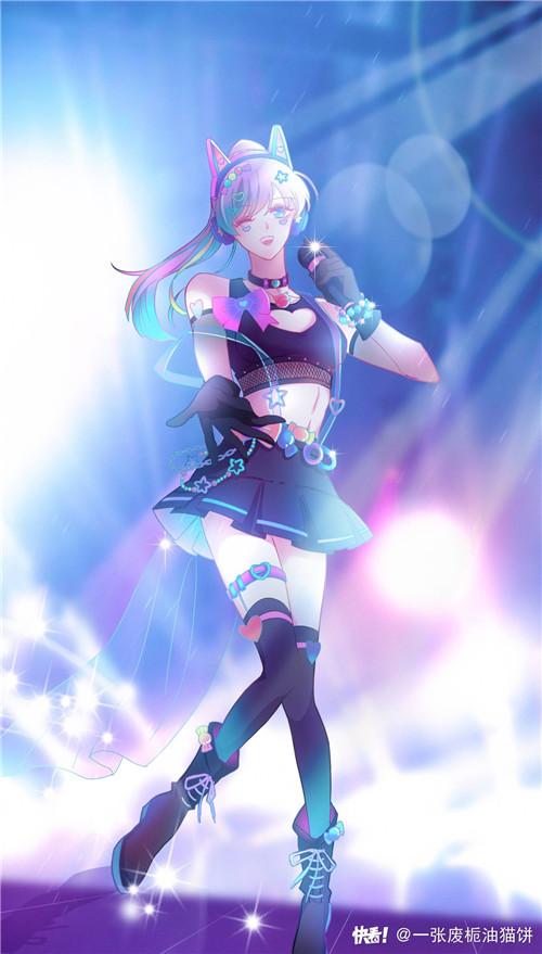 一张废栀油猫饼的灵感来自于当下流行的爱豆,她在服饰方面添加了糖果和猫耳元素,荧光配色在舞台的灯光效果下显出酷炫的闪耀感。