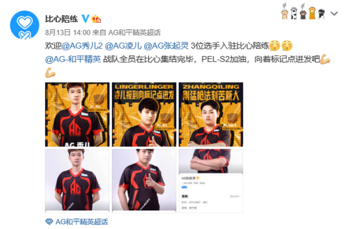 8月13日,AG战争精英三位新选手秀儿、凌儿以及张起灵官宣入驻比心陪练。三位新人退出后,AG战争精英战队正在比心告竣全员调集。