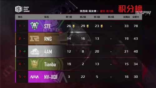 第三局航线从P港飞往S城。阶段三4AM开始发力,先抓住NV-XQF和ELG互打时机,拉到房区分别将两队剿灭,后又淘汰想来争夺房区的AgFox,奈何圈运不济,最终被Tianba堵死在进圈路上。决胜时刻,信号区刷到战地医院南侧麦田,SMG、AG、STE三方混战,SMG率先淘汰AG,STE趁机全员出击各个击破,最终将AG灭队,打破纪录完成了PEL S2赛季的第一个三连胜!