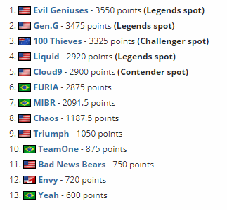 目前北美RMR积分榜依旧由3550分的EG战队领跑,紧随其后的是GenG与100 Thieves,由于Liquid之前发生了选手变动因此损失370分跌落第四,仅仅领先第五名的Cloud9二十分。紧随其后的黑豹FUIRA能否逆转乾坤,就要看本次赛事的发挥与表现了。至于第七名的MIBR想要晋级,或许只有奇迹发生,毕竟2091分与之前差距实在过大。