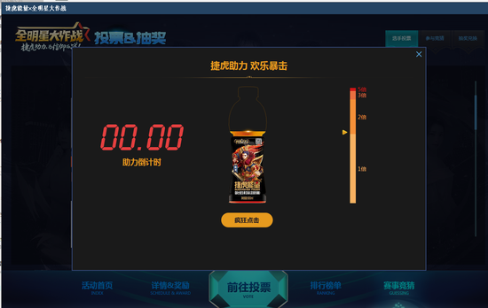 在投票过程中,玩家可以通过“捷虎小游戏”获得最高五倍票数暴击。只需要快速点击按钮,使捷虎能量瓶身填充完毕即可。简单刺激又高收益的小游戏,玩家自然乐得参与,在游戏的过程中不知不觉实现了捷虎品牌在玩家心中的深植入。