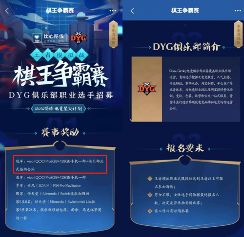 去年11月,比心陪练联合DYG举办的王者模拟战棋王争霸赛暨DYG自走棋职业选手招募活动中,来自比心陪练的自走棋陪玩大神小飞(比心id =84672227,现职业id=麒麟)脱颖而出,获得俱乐部签约,作为战队主力队员参加王者模拟战比赛。2020王者模拟战职业大师赛春季赛中,DYG也成功晋级总决赛,获得亚军。