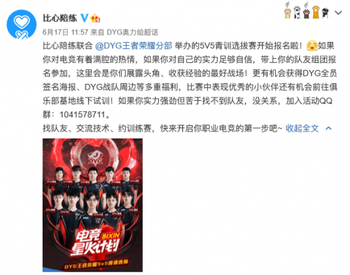 比心陪练平台覆盖了数量众多的优质游戏玩家,拥有4000多万用户、500多万游戏陪玩大神的比心陪练,是高能“路人王”们的聚集地。据比心陪练和DYG官宣微博显示,DYG就青训招募活动与比心陪练达成合作,比心陪练平台作为DYG战队官方青训招募平台,为DYG举办多次青训招募活动。