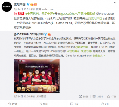 第二天,JDG与索尼中国经过民间微博联动、公布音讯,为游戏喜好者抽送2台索尼游戏电视X9100H!同时JDG正在文中提到:“#电竞搭档,索尼电视#超高清年夜屏、畅享游戏无量乐趣,看回放、看直播流利顺滑更过瘾。”深谙游戏玩家需要的年夜法,这次与职业电竞战队JDG开展协作,堪称这位行业王者的又一次探究与翻新。
