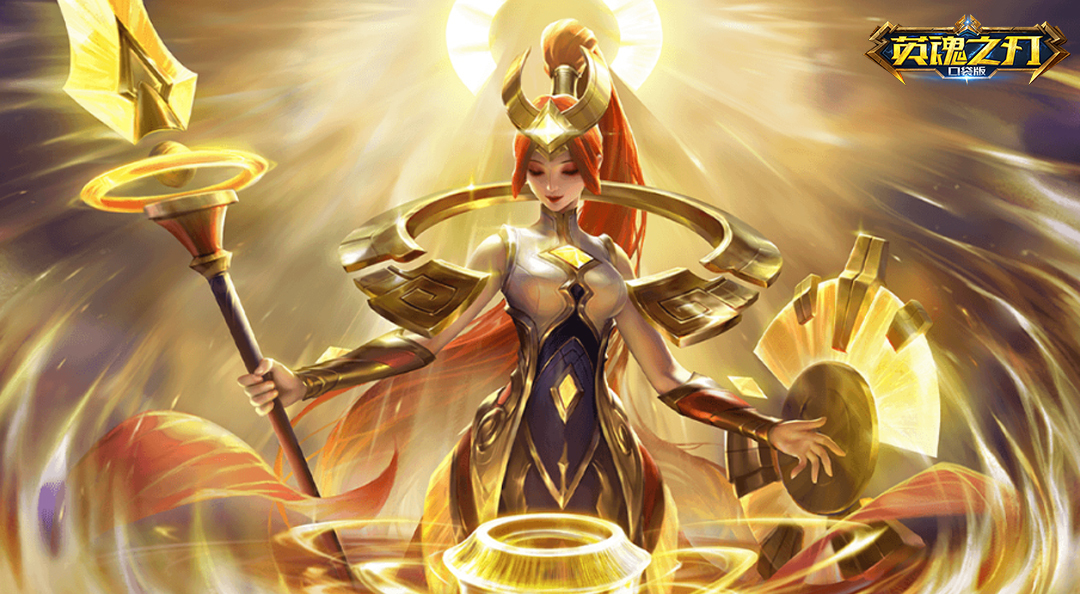 作为神明,花木兰“天兆启明”满身泛微光,裙摆、头饰、武器之间金光闪动,神明的肃穆感油但是生。同时,为了表现女性的优美,皮肤还退出了女性化铠甲的设计,既能有拦阻内奸的坚毅,也有女神的神圣、温顺、漂亮。