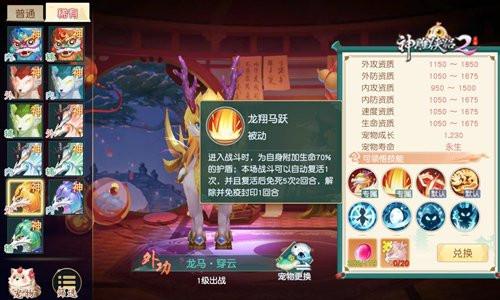 无论哪种属性的龙马都具有1个同样好用的专属技能“龙翔马跃”,可以在进入战斗时,为自身附加生命70%的护盾。且在本场战斗中可以自动复活1次,并在复活后可免死5次2回合,解除并免疫封印1回合。拥有这样的技能,是不是就让大侠队伍的整体续航能力有了显著提升?即便是宠物在一开始就被集火,也因为拥有了免死的技能可以保证持续的输出或治疗。