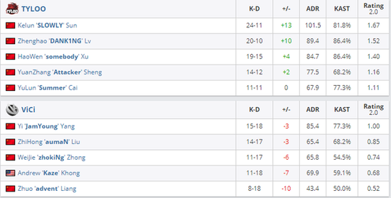 但第十回合,TYLOO选择ECO。VG选择了在对手ECO局只派两名队员去控事故多发的二楼,这一下正好落入TYLOO的陷阱。没能打出人数优势的VG随着一波便秘进攻又被SLOWLY和somebody阴死两人,TYLOO也完成了ECO翻盘。次局VG选择慢速夹A又陷入了TYLOO四人赌A的重兵防守,比分来到7-5。