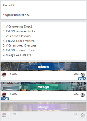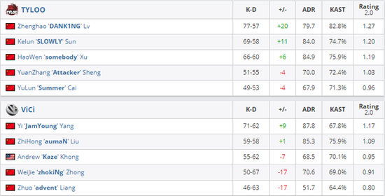 ESL科隆亚洲区的胜者组决赛,对战双方还是熟悉的TYLOO对阵VG。图一中TYLOO一度拿到了7个赛点,可顽强的VG差点将比赛拖进加时,惜败在常规赛中最后一回合。图二中双方展开了残酷的拉锯战,互相紧咬比分互不相让,而VG利用强起翻盘将比赛拖入加时,并且成功拿下图二。可在图三中TYLOO还是更加成熟,以大比分轻取图三,成功挺进总决赛。