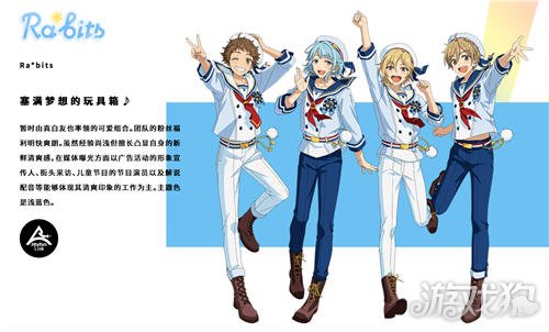 在由乐元素开发的音乐节奏手游《偶像梦幻祭2》中,可爱组合Ra*bits拥有着众多粉丝,也是游戏中的可爱担当!真白友也、仁兔成鸣、天满光、紫之创四位美少年可爱的表演,拥有着治愈的可爱力量。下面就来了解一下可爱组合Ra*bits吧!