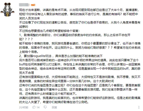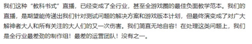 简单概括该篇公告内容就是,官方对玩家感到深深抱歉,并对此前的直播、客服态度进行道歉。而在游戏方面,则是保证会对剧情进行修改、调整可能令玩家不快的角色互动关系。同时也会针对游戏玩法、战斗体验进行优化,尽可能让玩家体验到这款游戏的乐趣。