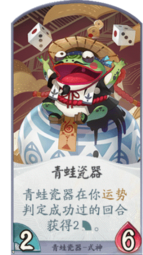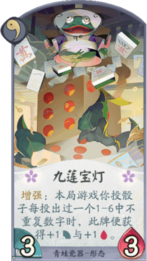 田鸡磁器的两种形状“门前清”以及“九莲宝灯”,是他站场才能最要害的两张牌。正在二勾玉阶段,“门前清”优秀的血量以及运势成果,确保了他是一名十分难以应酬的肉盾式神。