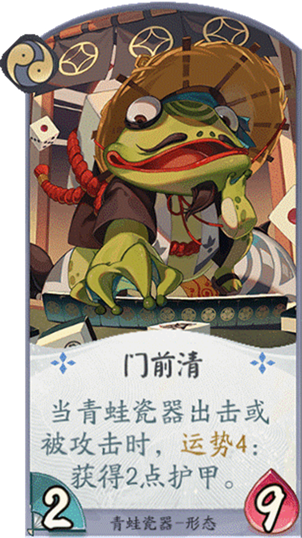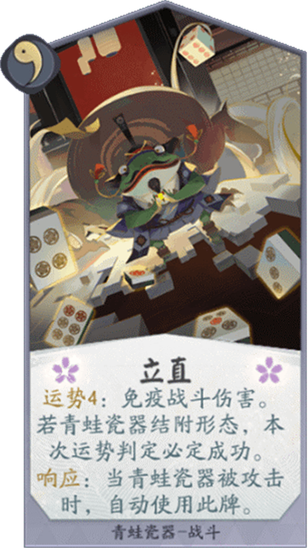 作为一位赌鬼,田鸡磁器十分擅长“出千”,能够正在每一次战役时取得护甲加成。经过“转运”,他能够断定一次,胜利即随机弃掉两张手牌并再次攻打。当田鸡磁器“立直”,他的防御会免疫战役损伤,这张牌另有呼应成果。
