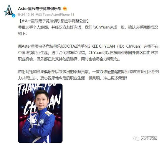 8月24日,Aster官宣ChYuan的选手合同将冻结保留,他可以在东南亚等国外赛区自由组队: