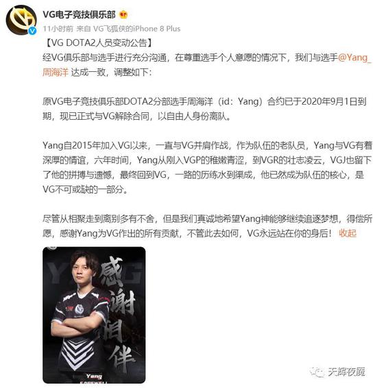 昨天VG战队官宣了Yang神和R神离队的消息: