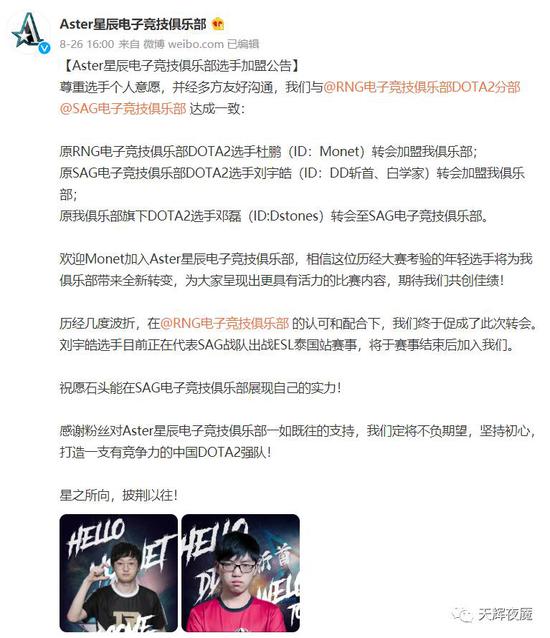 8月26日Aster官宣原RNG选手Monet、原SAG选手DD斩首、白学家加盟,Dstones转会至SAG: