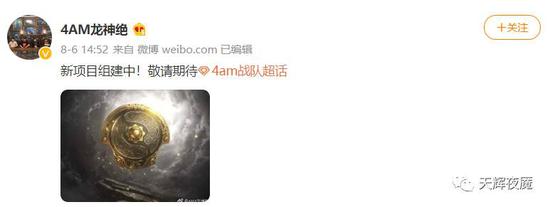 8月6日,4AM俱乐部经理龙神绝发消息称“新项目组建中!敬请期待”,并配了一张TI10的KV。一石激起千层浪,吃鸡豪门进军刀圈的消息不胫而走,各方对于其阵容的猜测也是五花八门。