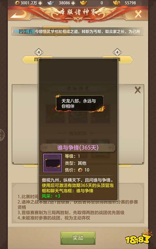 获得本服前四则可以获得谁与争锋聊天框和落尽八荒头像框。本服晋级赛二强可以获得橙色品质称号独步江湖。