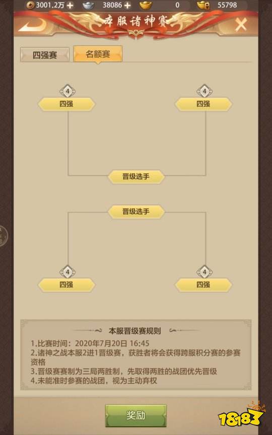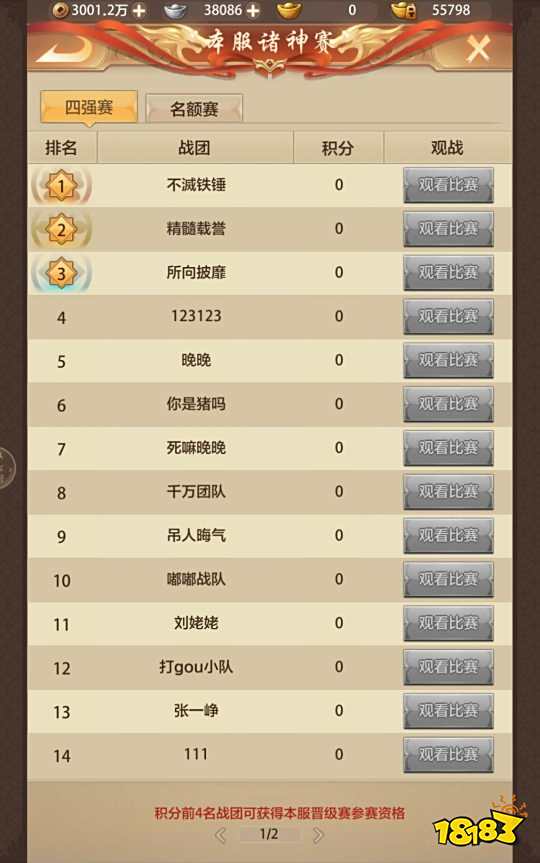 积分前四的四个战团晋级本服晋级赛,三局两胜制,优先取得两胜的战团可以参加诸神之战的跨服积分赛。