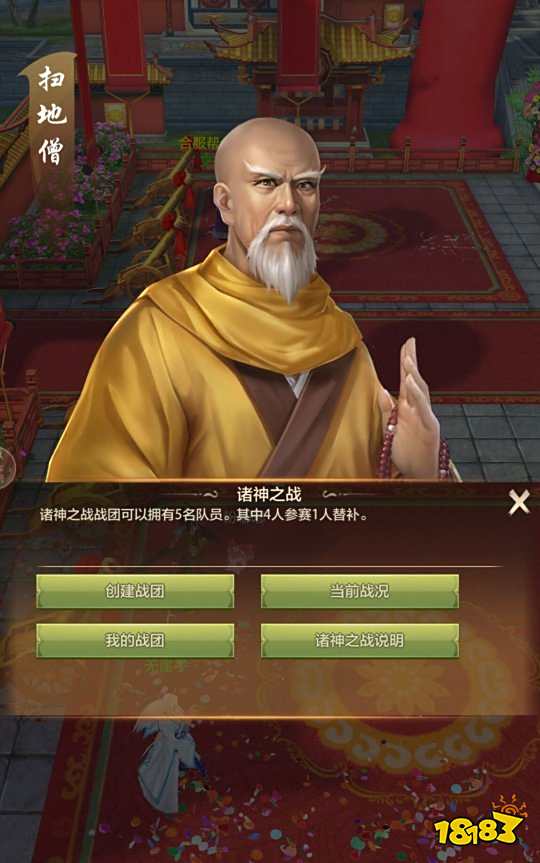 诸神之战是一个组队活动,是四人参赛。但是团队有五人,四人参赛一人替补。而且和华山相同,同职业成员不能多于两人。也就是说,不可以出现三个峨眉的情况。