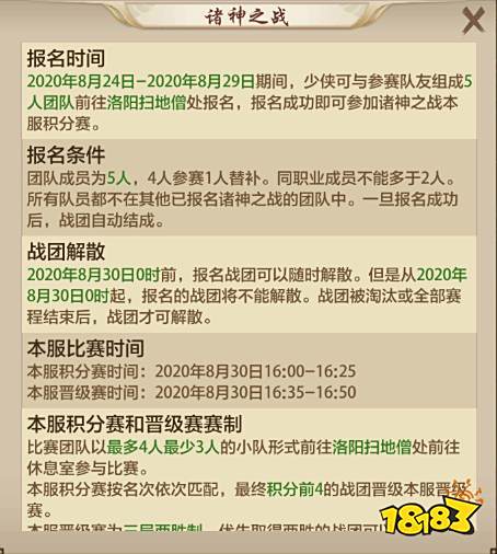 举个例子,假设诸神之战的报名时间是8月24到8月29日,前往洛阳扫地僧处报名,报名成功即可参加本服积分赛。积分赛时间则在8月30,晋级赛也在当天举行,在积分赛之后。