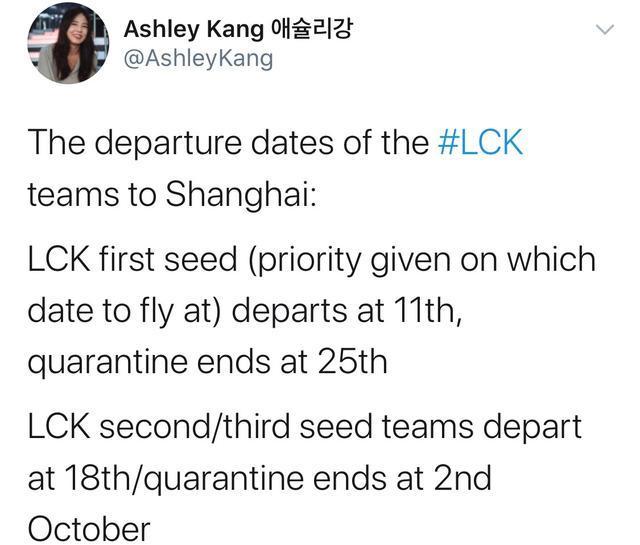 韩国记者Ashley Kang在推特上分享了本次全球总决赛LCK赛区队伍抵达上海以及完成新冠隔离的日期。其中一号种子和二、三号种子是分别抵达的,原因如下: