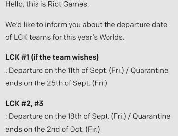 之前LCK三号种子9号打完最后一场比赛,11号出发去上海,以便可以在9月末完成隔离参加入围赛,这样密集的时间安排引发了LCK粉丝的讨论,大家认为由于LCK常规赛和季后赛时间安排不到位,导致三号种子时间太赶了,会影响世界赛的发挥。最近,由于越南赛区无法参赛,赛程调整之后,LCK的三支战队时间安排也有了变化。
