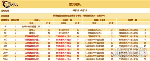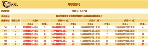 活动专场期间,充送达到指定金额,即可领取SS神器碎片或暗器碎片.