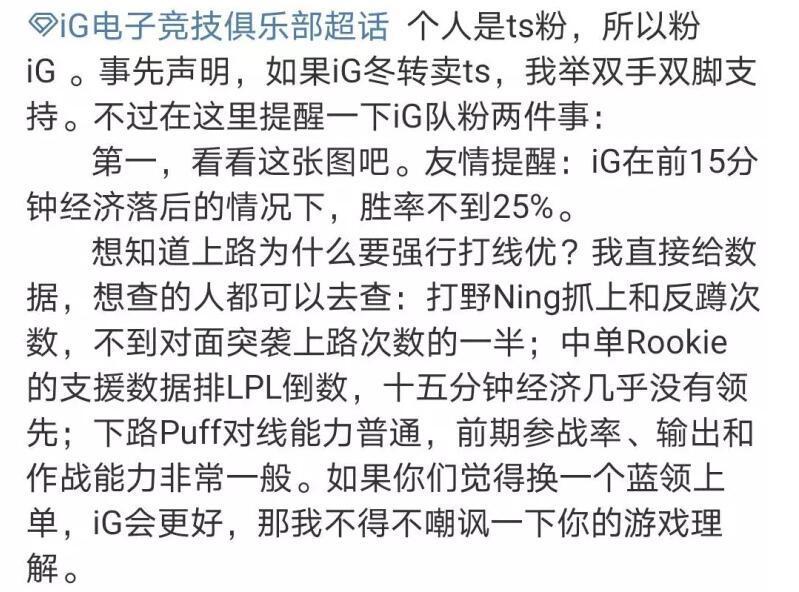 相比于在赛后相互摔锅,更重要的是是发现问题并进行解决。很显然,IG的三叉戟战术在某种角度上而言可以无视版本,但是同样的这种战术容易带来很大的隐患:若是没有取得优势便会被版本强势阵容从头压制到尾。或许,相比于换一位选手IG准备另一套战术或许是更好的选择。毕竟Rookie很强,Theshy也会玩奥恩这种蓝领上单,与其三叉戟刚到底准备备用战术或许能够在下个赛季带来更加惊人的效果!