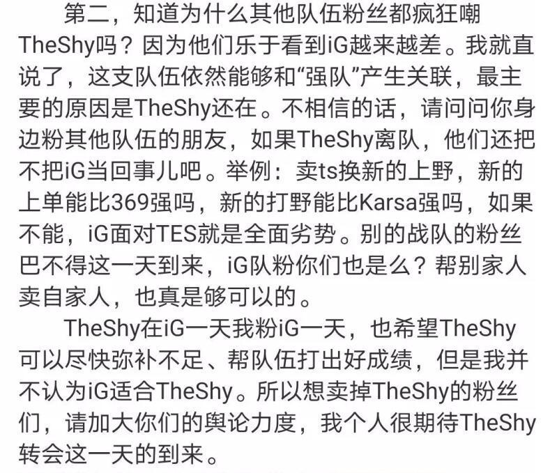 然而对于粉丝们之间相互攻击的行为笔者认为大可不必:Theshy和Rookie作为队友每天生活在一起训练在一起,二人的关系无比亲密然而作为两家的粉丝却在网络上掐架。这典型的没事找事不是么,笔者私以为,IG之所以没有进入到世界赛和所有的选手都离不开关系。无论是Theshy还是Rookie还是宁王,都需要为这个赛季的失败承担责任。