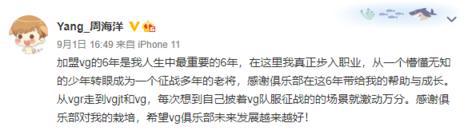 9月1日,VG正式官宣,原VG电子竞技俱乐部DOTA2分部选手周海洋(id:Yang)以自由人身份离队,尽管从相聚走到离别多有不舍,但就对于VG.Yang的选择,无论是俱乐部还是粉丝,都选择尊重与支持,无论Yang日后挂上哪队的队标,VG都见证了Yang作为三号位的辉煌,或许是换一条道路继续征战,或许是换种方式休憩停留,不悔是最终的选择。