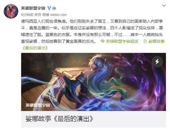 @英雄联盟宇宙官方微博公布了琴女娑娜的背景故事《最后的演出》,一起来欣赏一下吧。