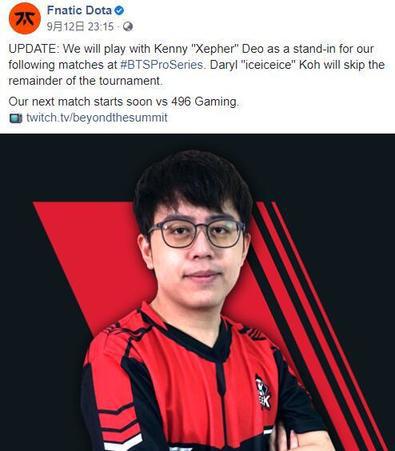 ESL One泰国站开赛前Fnatic的3号位iceiceice由于迟迟等不到官方赛事的消息宣布休息,直到DPC赛事重启。不久之前V社发布了长文,公布了未来一段时间的计划。V社计划将在明年年初重启DPC赛事,并与明年8月举办TI10。因此iceiceice也选择提前回归队伍,尽快与队伍磨合备战。但是在最近的BTS Pro S3比赛时却因一些原因iceiceice无法参赛,因此Fnatic不得不再次寻找替补,前Geek Fam选手Xepher暂时替补三冰出战BTS Pro S3。