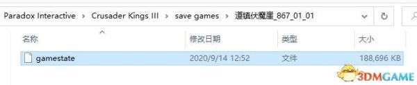 6.修改完毕后保存,并将后缀名改为.ck3,请注意这一步不需要重新压缩,直接将改好的gamestate.ck3拖回*:\Documents\Paradox Interactive\Crusader Kings III\save games