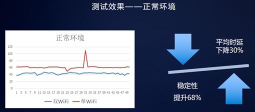 对于华为今年开放给厂商双WiFi功能,赵毅敏将其称为“无线优化利器”。通过双WiFi功能,手机将实现在无线路由器2.4GHz和5GHz两个频段上同时收发数据,2.4GHz较好的穿透性为5GHz提供数据传输做出有效补充,实现了更好的用户体验。测试显示,正常环境下用户网络稳定性提升68%,平均时延下降30%;弱网环境稳定性提升88%,平均时延下降82%。