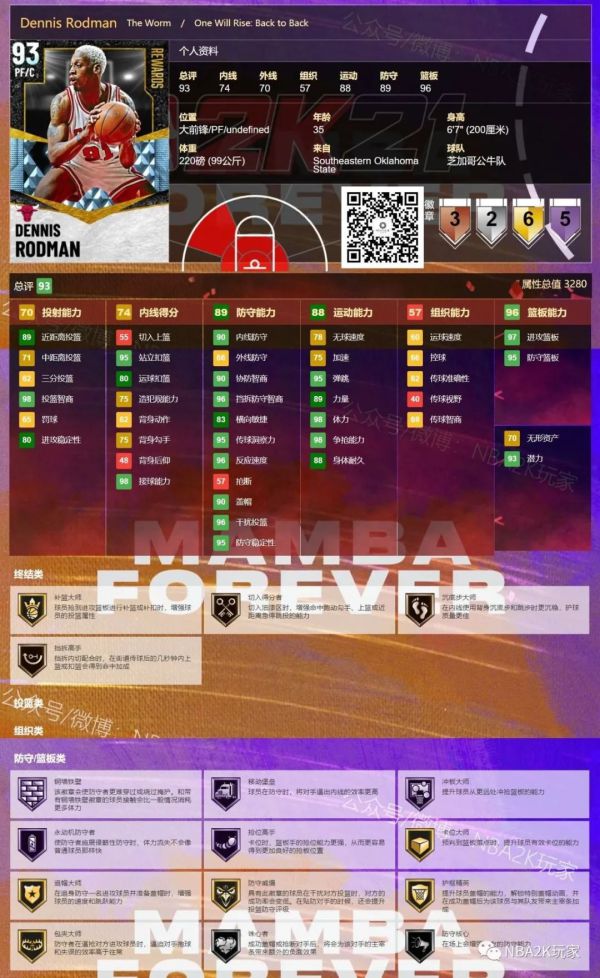 这张锁包的钻罗德曼总值3280,功能性非常明显的卡,防守端属性比较不错,给了90的内防、83横移、90盖帽和96干扰投篮,双板给到了97、95,徽章也相当可以,大前期5枚防守类名人堂徽章,只是死亡缠绕没给到。