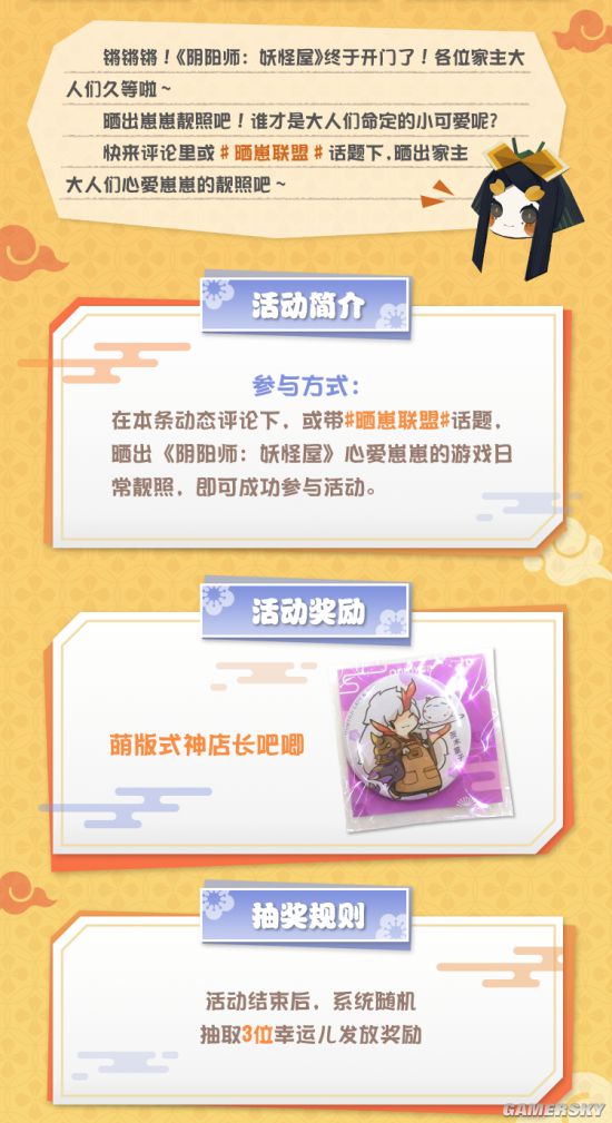 即日起,玩家可登录大神APP ,在大神 #晒崽联盟# 话题下,晒出《妖怪屋》游戏内最喜欢的式神靓照即可成功参与活动,投稿成功即有机会获得萌版式神店长吧唧*1!