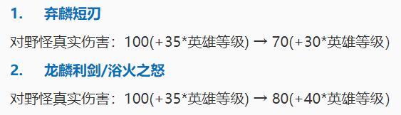 另外对新的打野刀进行了调整,将对野怪的真实伤害进行了基础和成长的降低,我觉得这么做的意义就是因为惩击的伤害被增加了太多了,总伤害都超过了传统的惩击,另外对新版打野刀附带的惩击也设置成了和寒冰惩击一致,攻击低血量的目标,附近有敌人,会对野怪和敌人分别造成一次伤害。