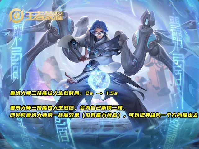 鲁班大师再一次的调整,大招从最开始的2.5秒降至2秒,这次直接降至1.5秒,被诟病拉不到人的问题解决了,经过测试,现在可以很容易的拉到更多的人,虽然比之前的瞬拉差了很多,但别忘了这是个aoe瞬发群控。