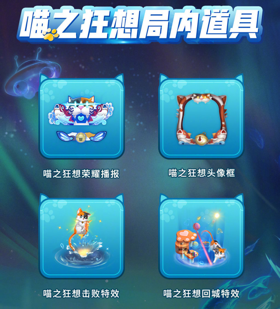 进阶战令的四件套分别是喵之狂想荣耀播报、喵之狂想头像框、喵之狂想击败特效和喵之狂想回城特效,每一个套件都跟猫咪和鲤鱼有关,非常可爱又有趣,而且这只猫咪一直都想抓小鲤鱼哦。