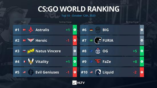 随着Astralis、FaZe Clan相继捧起EPL S12欧洲区及IEM纽约站的冠军奖杯,九月国外CSGO大型赛事到此正式告一段落。今日早时HLTV公布了最新的世界排名榜单,Astralis结束了长达五个月的颓势,从十名开外杀回反超Heroic重坐榜首。而另一边,在IEM纽约站欧洲赛区中有着良好表现的OG、FaZe Clan两队也连涨数名杀入前10席位。