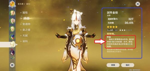 最后是取得容易,任务送一个! 璃月可以用岩之印换一个,如果你预约注册也是选这个法器,恭喜你直接就可以精炼3阶,精炼3阶每2秒回5点能量等于可以回到15点能量,加上凝光大招极低的CD12秒,所以我们可以加速大招恢复能量的速度。 你如果问我怎么还是一阶,我注册预约选了四星大剑结果除了诺艾尔没有别的大剑角色好用,岩之印拿去换一堆材料现在岩之印不够 (又还没时间去找岩神瞳),所以我的试作金珀还卡在精炼一阶。