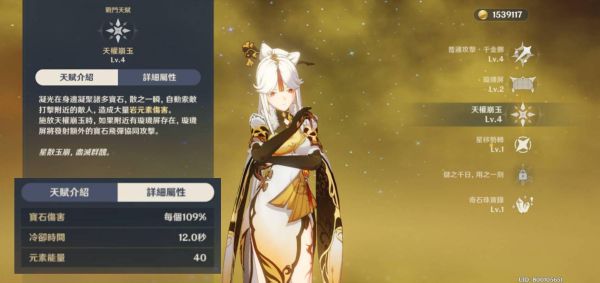 天权崩玉会招换六颗宝石攻击敌人,如果附近有璇玑屏会再额外招换六颗宝石攻击。目前天赋每颗109%伤害12颗有1308%的倍率,加上12秒低冷却与40低能量完美配合试作金珀,试作金珀虽然没有很好的附属能力,但是仍为四星武器基板面板攻击力完全可以上台面。举例自己皇女拿弹弓精炼5阶招换奥兹炸Aoe爆击3000多,凝光放屏也是3000多,但是爆击直接5000多,虽然两个职业不相同,但是相同打副本速度就快了很多,三星武器可以用,但是月卡玩家要及时止损,避免投入过多资源。