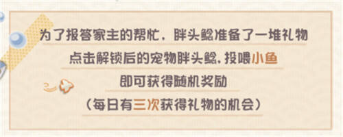 在解锁宠物胖头鲶后,家主们千万不要忘记每天去给它投喂小鱼并获取奖励哦!