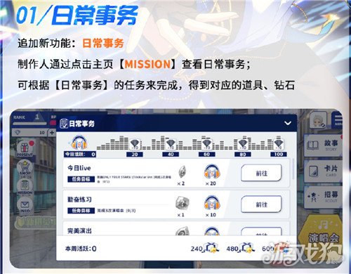 想知道偶像们平常都在做些什么吗,那就来亲自体验一下吧!本次预演测试追加了新功能:日常事务。制作人们可以通过点击主页【MISSION】查看日常事务,并根据每天的live目标来完成live。制作人们可根据每天的【日常事务】来安排每天的任务,完成后即可得到对应的道具、钻石等。